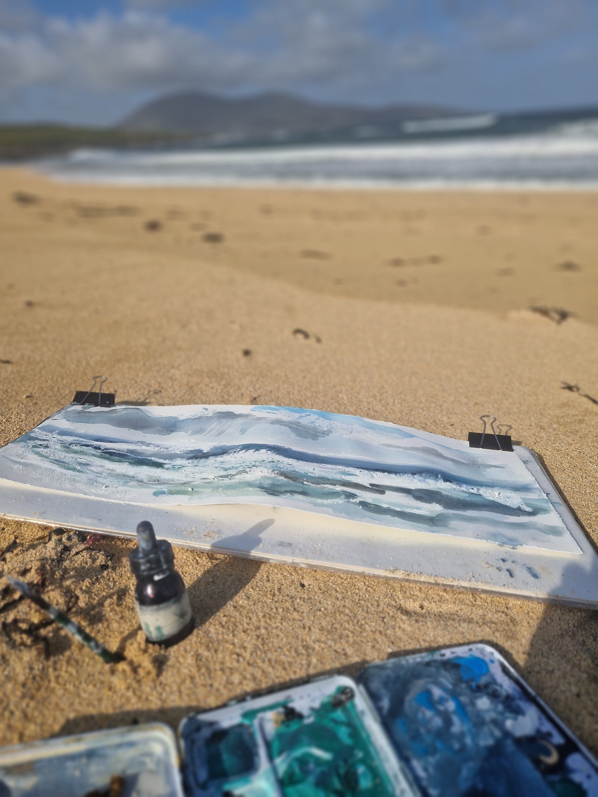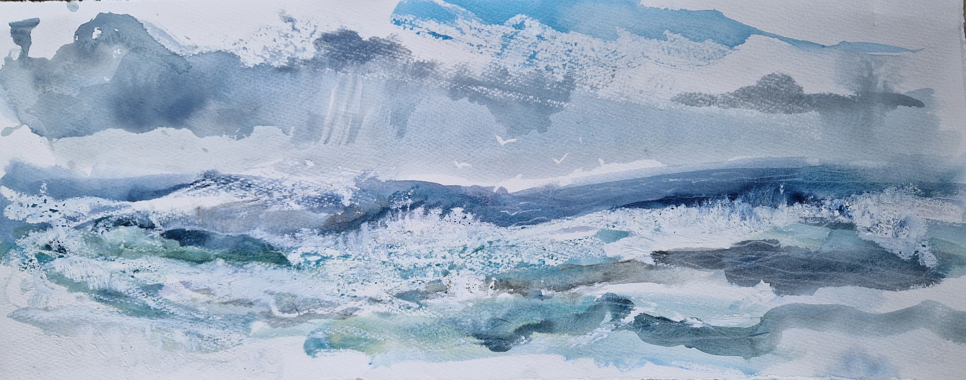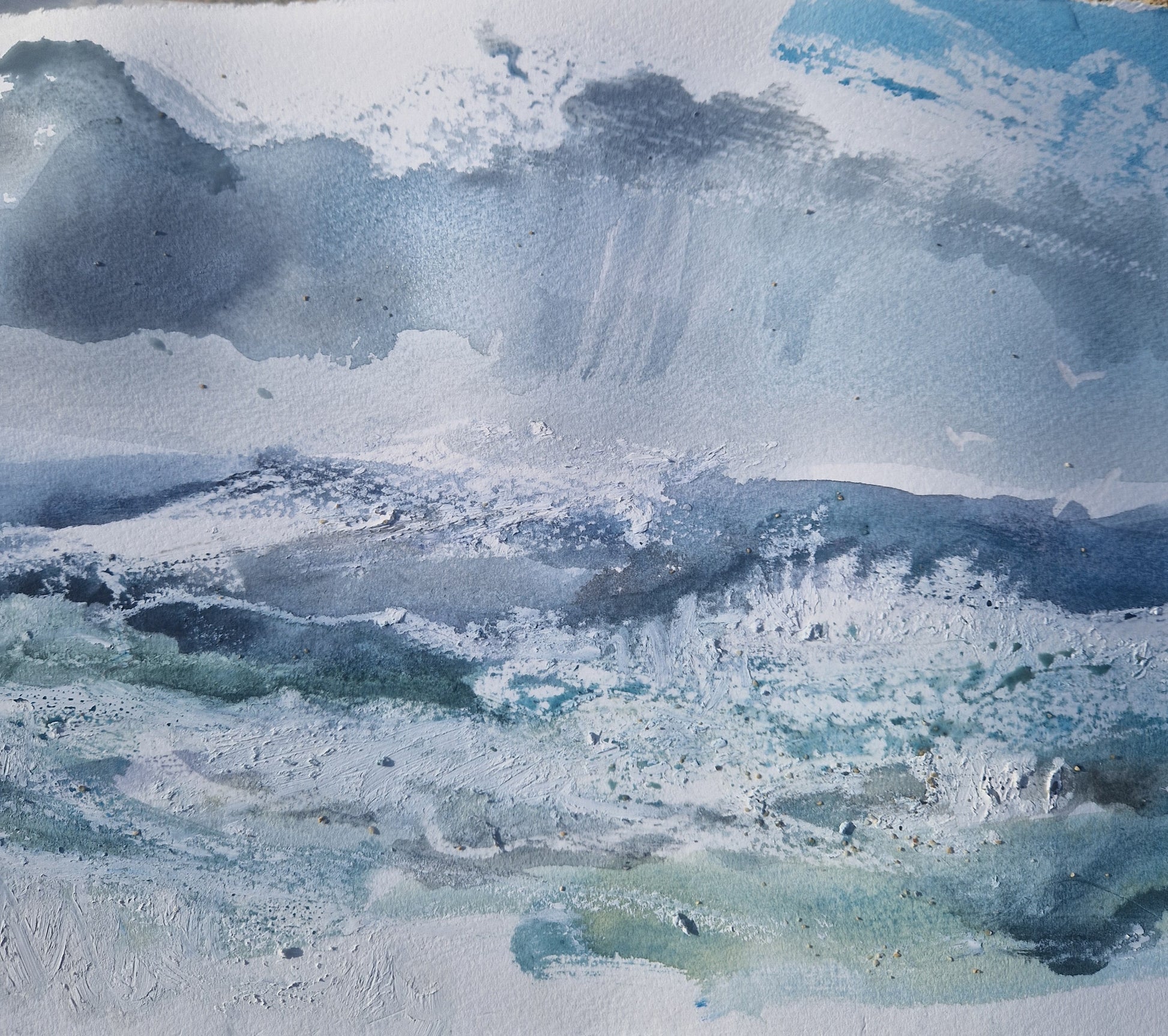 The gulls are playing a game. They bob and chatter in the lulls between the waves, then leap into the air seconds before it breaks over them. Swooping and circling, only to land in a lull, waiting for the next spilling breaker. It’s dawn, crisp and early, and I’ve made the only footprints in the sand as I sketch the coming tide. From Borvemor Arts Residency, Summer 2025