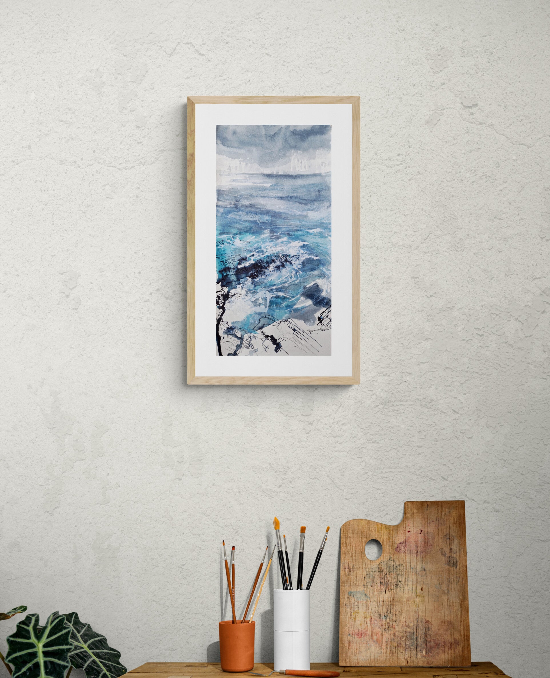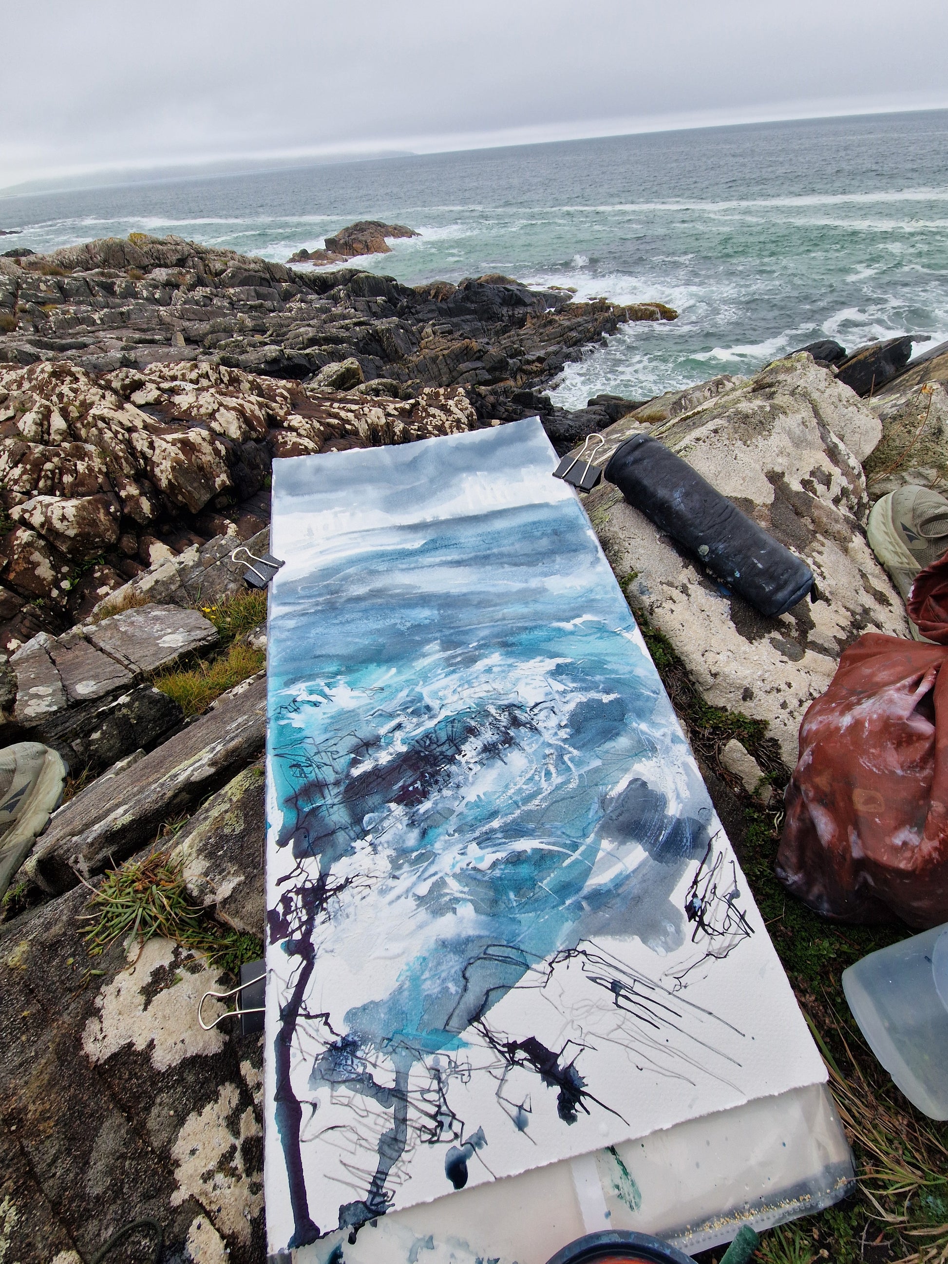 I tossed my sketching kit on my bike and cycled through the morning light in search of waves. The Atlantic rollers were easily found as the last waves of Storm Floris battered the coastline. Clambering onto a rock, I tracked the waves in fascination, drawing and redrawing their patterns. Perched too close, I eventually scrambled back to a safer distance, out of range of rogue waves. The waters swirled, tugging and towing at the inky rocks. Count to seven and watch the power build… From Borvemor Arts Residency, Summer 2025